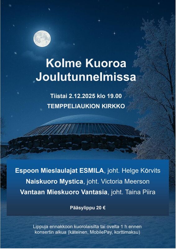 Espoon Mieslaulajat ESMILA, johtaa Helge KõrvitsNaiskuoro Mystica, johtaa Victoria MeersonVantaan Mieskuoro Vantasia, johtaa Taina Piira.