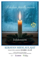 Keravan Mieslaulajien perinteinen joulukonsertti Keravan kirkossa perjantaina 19.12.2025. Illan aikana on kaksi esitysta - klo 18.00 ja 20.00.Keravan Mieslaulajia johtaa musiikkineuvos Teppo Salakka.Konsertissa laulaa myös kanttori ja bassobaritoni Janne Kaksonen säestäjänään Teppo Salakka.Mukana myös yhteislauluja.Käsiohjelma 10 €. Niitä saa ennakkoon laulajilta ja Tyykipuodista (käteisellä), sekä ovelta ennen konsertteja. |